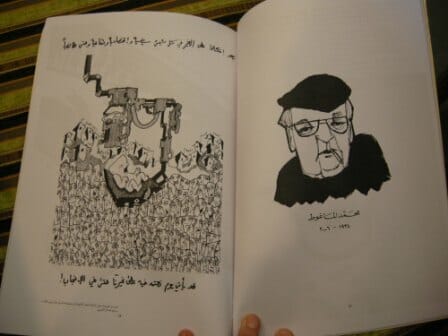 Seven of the thirteen artists contributing to Muktatafaht were able to attend the fair. The collection itself is in no way intended to be comprehensive (what a feat it would be to include all of the vast talent working in the region today!), but to highlight pieces by artists with whom we have worked on various programming over the past year, and whose work we find particularly compelling. Pictured above are (from left to right) is the Cario-based Tok Tok contributor Mohammed Tawfik, Tok Tok co-founder and contributor Mohamed el Shennawy, myself, Beirut-based Samandal contributor Jana Trablousi, Egyptian comic artist Magdy el Shafee, U.S. based comic scholar Nadim Damluji (not a contributor but a new friend and colleague), author of “Falasteezee” Mahdi Fleifel and Jordan-based political cartoonist Nidal Elkhairy. (Not pictured: Samandal contributor Barrack Rima.)
