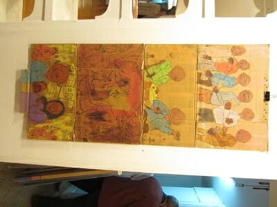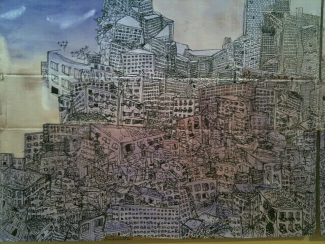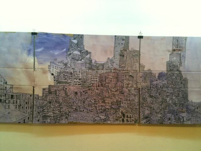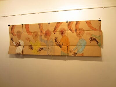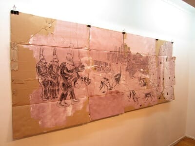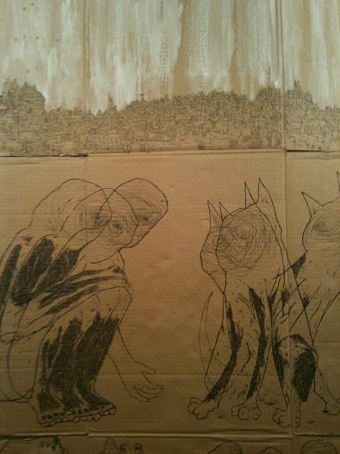 Characters change from piece to piece, but they retain certain characteristics and attitudes, often dystopic and terrifying, clearly rooted in Cairo’s environs but with elements of a universalist a-human, dys-human, fantastical nature.