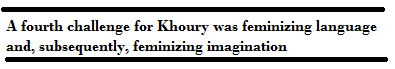 A fourth challenge for Khoury was feminizing language and, subsequently, feminizing imagination. Khoury believes literature differs from religion in that literature has the potential to be feminine. He wanted to explore a way to liberate and feminize Arabic language through narrative. Doing this also enabled him to move beyond the scripted tropes of “orientalization” expected in Arabic literature. Falling prey to expectations and giving readers something they’ve already had results in orientalism. To avoid this, Khoury believes, writers must write what uniquely exists for him or her to write.