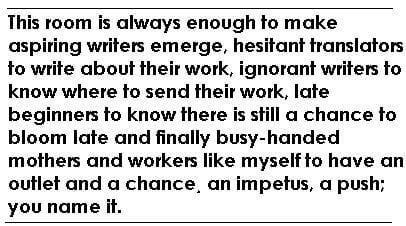 What is touching about Marcia Lynx’s blog, and naturally about “herself”, is the space she gives to everyone to express and post. Not that she accepts any post or every post, but the room she generously offers for those who seriously want to participate is a smart one. This room is always enough to make aspiring writers emerge, hesitant translators to write about their work, ignorant writers to know where to send their work, late beginners to know there is still a chance to bloom late and finally busy-handed mothers and workers like myself to have an outlet and a chance¸ an impetus, a push; you name it. With all those different types of participants and viewers, the salon hostess knows what she is doing. She is never a sticky hostess or a careless one. The perfect balance is never lost from her hands.