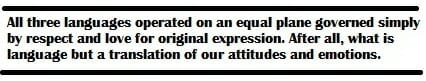 I was mostly impressed with the multilingual nature that permeated every interaction of the exchange. Not once did a single language supersede or subvert another. When asked a question in French, a translator was not far to offer his or her interpretation. If that French speaker was bi-lingual I did not hesitate to respond in Arabic and was not surprised to hear my statement being translated into English to include someone else in the conversation. All three languages operated on an equal plane governed simply by respect and love for original expression. After all, what is language but a translation of our attitudes and emotions.