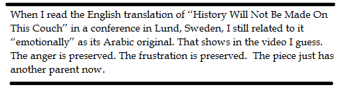 When I read the English translation of “History Will Not Be Made On This Couch” in a conference in Lund, Sweden, I still related to it “emotionally” as its Arabic original. That shows in the video I guess. The anger is preserved. The frustration is preserved. The piece just has another parent now.