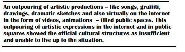 An outpouring of artistic productions — like songs, graffiti, drawings, dramatic sketches and also virtually on the internet in the form of videos, animations — filled public spaces. This outpouring of artistic expressions in the internet and in public squares showed the official cultural structures as insufficient and unable to live up to the situation.
