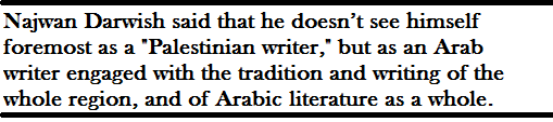 Darwish talked about the similarity of the situation in Palestine to apartheid South Africa, to the Native American reservations, and to the systematic discrimination practiced by the Nazis and Italian fascists. He perceptively pointed out that it is Ashkenazi Israel that is exiled from its surroundings; we [the Palestinians] who live there are not exiled, rather it the piece of land that Israel occupies that is exiled.