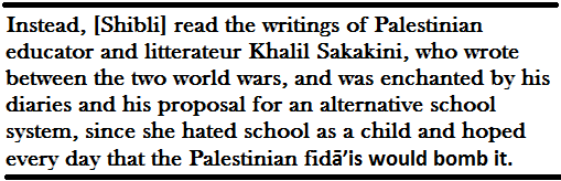 Shibli spoke about her experience with Palestinian literature, which was literally banned inside Israel when she was growing up, outside of one publishing house that distributed Ghassan Kanafani’s work. She talked about the large family in which she grew up, where her father wouldn’t let her read Kanafani till she was 13. Instead, she read the writings of Palestinian educator and litterateur Khalil Sakakini, who wrote between the two world wars, and was enchanted by his diaries and his proposal for an alternative school system, since she hated school as a child and hoped every day that the Palestinian fidā’is would bomb it. It was Sakakini’s diaries which inspired her to write her own diary every day, a habit which she kept up till the age of 21. Kanafani really impressed her as an existential writer along the lines of Sartre.