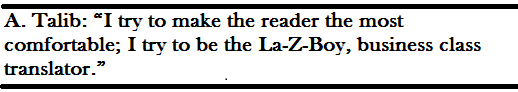 Talib and Abou Bakr espoused different strategies with regards to idiomatic expressions. “I generally don’t try to preserve the religious dimension of everything in the passage – but at the same time I’m not one of those translators who try to make Arabs read like French secularists,” said Talib. “I don’t de-Godify the Arabic text. But the danger is that keeping all the religious references can play into the stereotypes that a foreign reader might have about Arabs.”