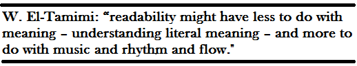 Abou Bakr embraced a different strategy. “I would translate a metaphor like that, because it reflects something about the culture, what they think about women. It might not be appealing to a western audience, but to me – who cares. I think of literary translation as an act of cultural exchange and I think of the text as communicating the culture it came from, and that is usually the thing I care about most about translation, which is why I tend towards foreignizing the text for the target reader. I don’t go with the comfort principle because I want the target reader to make extra effort at understanding and communicating with this culture, which is why I think the text should reflect the source culture. At the same time I like to be as invisible as possible as a translator.”