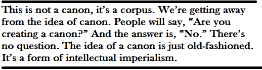 This is not a canon, it’s a corpus. We’re getting away from the idea of canon. People will say, “Are you creating a canon?” And the answer is, “No.” There’s no question. The idea of a canon is just old-fashioned. It’s a form of intellectual imperialism.