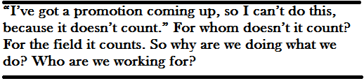 Obviously it’s not going to change soon, but hopefully this can help change the way the kind of work we’re doing is evaluated for tenure purposes and promotion purposes, because that’s how people decide how they’re going to devote a semester of their time. “I’ve got a promotion coming up, so I can’t do this, because it doesn’t count.” For whom doesn’t it count? For the field it counts. So why are we doing what we do? Who are we working for?