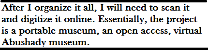 So, this is the archive that I am dealing with as a visual artist. After I organize it all, I will need to scan it and digitize it online. Essentially, the project is a portable museum, an open access, virtual Abushady museum. I proposed this project for post-doctoral work, and I have a place offered me at Winchester School of Fine Art at the University of Southampton, in their PhD program for visual artists. It is a program that emphasizes interdisciplinary research across the arts. I am looking for funding so that I can start. In the meantime, I have a book to write.