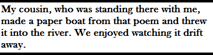 But in the morning, when the sun and some flies woke me up, I went downstairs and started to write those fables in my notebook my own way, and I illustrated them. Then, when I was about twelve years old, I wrote what I thought of as a poem for first time. That was on a ship on the Tigris River with family and relatives. My cousin, who was standing there with me, made a paper boat from that poem and threw it into the river. We enjoyed watching it drift away.