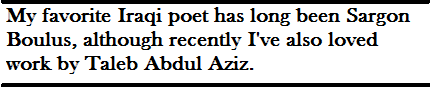 DM: My favorite Iraqi poet has long been Sargon Boulus, although recently I’ve also loved work by Taleb Abdul Aziz. I never liked everything a poet writes, not even my own poetry, which is why I only publish selections of what I write. I’ve also been fascinated by Muhammad Khudayir’s work of creative nonfiction, Basrayatha. But I was most influenced by mythology books from around the world.