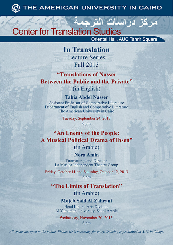 […] of AUC’s Center for Translation Studies lectures. Dr. Tahia Abdel Nasser talked about “Translations of Nasser: Between the Pulic and the Private“: […]