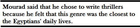 Speaking in a quiet and pleasant tone, Mourad does not really look like the classical and experienced thriller writer that he is. One could say that, despite his age, he is one of the pioneers of this genre in Arabic, as the genre suffers from a lack of pure detective stories, namely those books where the detective hunts the criminal. Mourad said that he chose to write thrillers because he felt that this genre was the closest to the Egyptians’ daily lives. By reading crime news in the newspapers, or going through crime cases, the Egyptians have developed practical minds and a detective-like intuition. This is also the reason why, in Mourad’s books, the common people, and not the police, solve the cases.