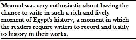 Mourad was very enthusiastic about having the chance to write in such a rich and lively moment of Egypt’s history, a moment in which the readers require writers to record and testify to history in their works. “With the written word, Egypt will be born again,” Mourad affirmed in Mantua, and in saying so acknowledged the contribution to the changes in Egypt made by the intellectuals of his generation. He also added that he would like to experiment other artistic means — like playing an instrument if only he knew how! — to further contribute to his country.