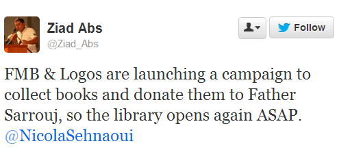 Les Scouts du Liban, Tripoli Branch — about which I know nothing more than their call on Facebook — has also posted a call for donations. The group, based in Tripoli’s St. Maron Church, “is launching a campaign to collect books and donate them to Père Sarrouj, the owner of the library, so that this historical library opens again as soon as possible.”