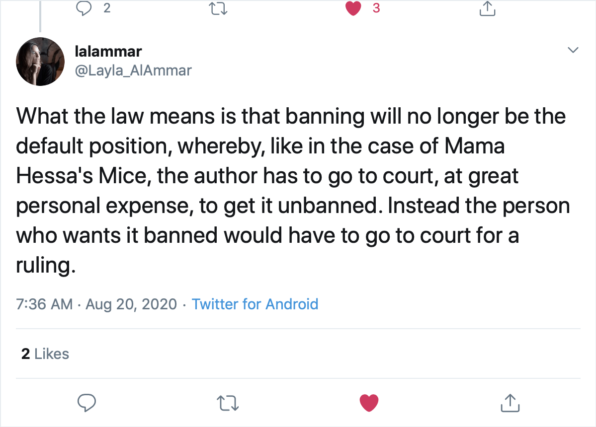As parliamentary observer Abdulla Khonaini wrote yesterday on Twitter, this means that books will no longer be subject to a required prior censorship, although they can still be challenged in court on a case-by-case basis.